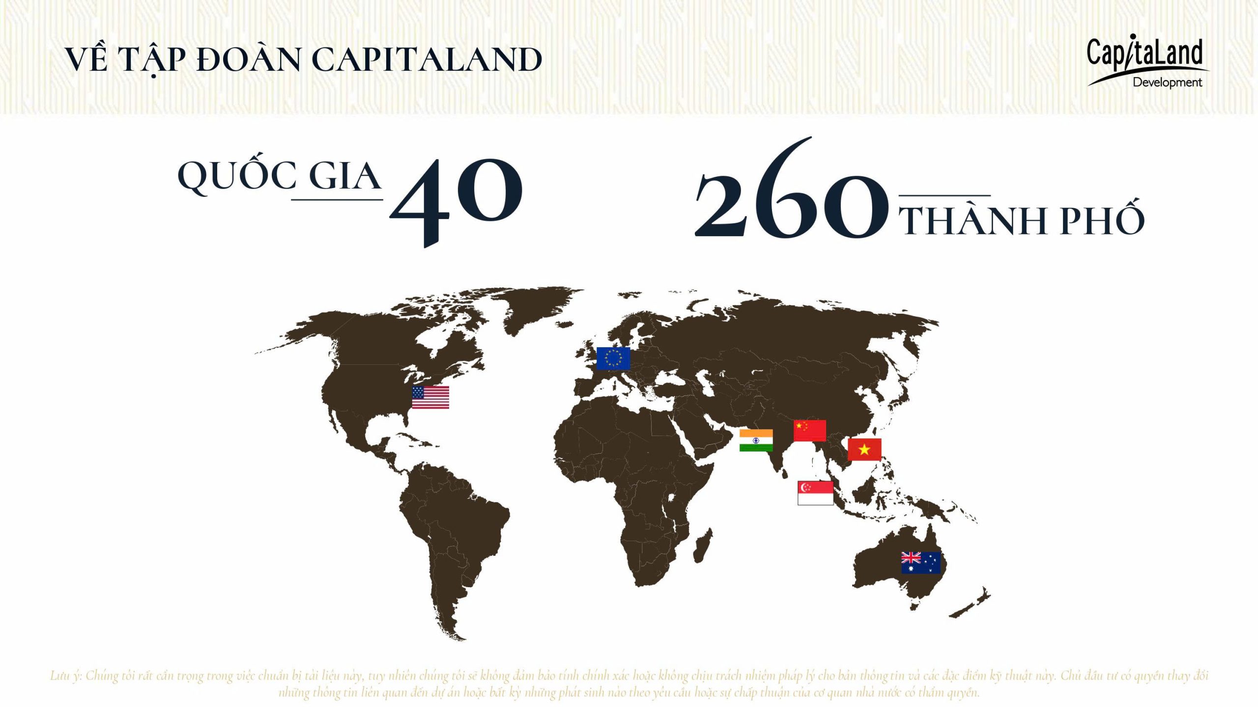Capitaland một trong những tập đoàn bất động sản đa ngành lớn nhất Châu Á trụ sở tại Singapore có mặt tại 40 quốc gia và hơn 260 thành phố . Đa dạng danh mục đầu tư : Dự án Phức hợp ,khu phức hợp văn phòng , khu bán lẻ , khu dân cư và nhà ở , khu công nghiệp , các khối hậu cần và trung tâm dữ liệu .